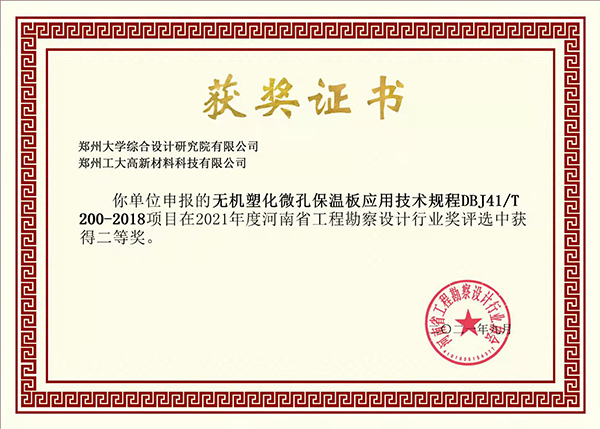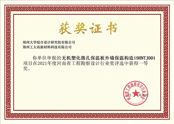 近日,“2021年度河南省工程勘察設(shè)計(jì)行業(yè)獎(jiǎng)評(píng)選”揭曉,由鄭州大學(xué)綜合設(shè)計(jì)研究院有限公司與我司共同申報(bào)的“無(wú)機(jī)塑化微孔保溫板外墻保溫構(gòu)造19HNTJ001”、“無(wú)機(jī)塑化微孔保溫板應(yīng)用技術(shù)規(guī)程DBJ41/T 200-2018”項(xiàng)目分別榮獲一、二等獎(jiǎng)。