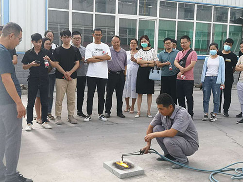 在車(chē)間外,我司工作人員現(xiàn)場(chǎng)演示了無(wú)機(jī)塑化微孔保溫板的吸水性、防火性、熱工性能等特點(diǎn),引起設(shè)計(jì)院專(zhuān)家的嘖嘖稱(chēng)贊。